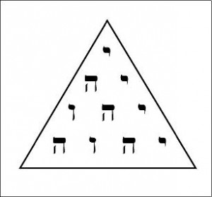 [2] The Tetractys is a symbol composed of ten dots in an upward-pointing triangular formation. It was a sacred pattern for the school of philosophers who followed the teachings of the Greek sage Pythagoras (lived 6th century BC). They used the Tetractys to swear their oaths upon, in much the same way that modern Christians swear oaths upon the Bible. The Pythagorean oath, as quoted by the Renaissance magician Cornelius Agrippa, is as follows: