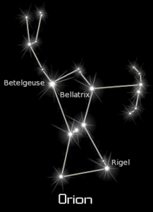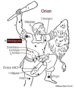 Betelgeuse[3] is one of the larger stars that can be seen in the night sky. It is the brightest orange or "ruddy” star in Orion constellation and marks its western shoulder of the Hunter or Giant, and it is the ninth brightest star in the sky. We are capable of understanding now the origin of the astrologer's idea that Betelgeuse heralds fortune, martial honors, wealth, and other kingly attributes. Betelgeuse alone comprises the fourth Nakshatra, the Hindu Moon Mansion, Ardra with Rudra, the storm god as its presiding divinity. This is, perhaps, the origin of the long established stormy character of Orion.
